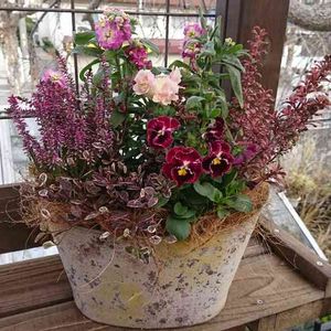 シックなカラーの渋目の寄せ植え 今日の神戸は午後から気温が低く、只今1℃です。風もあって気温より耐寒温度が低く感じます。 赤い鉢に、カラーリーフ中心に銅葉とワインカラーでまとめてみました。 夢咲きヴィオラの花色とフリルが全体を豪華に、フォーカルポイントの斑入りキンギョソウがオシャレさをプラスしています! 使用した植物は 夢咲きヴィオラ、ロフォミルタス“キャサリン”、キンギョソウ“ブランルージュ”、ビーツ“ブルズブラッド”、ヒューケラ“ドルチェ・ブラックベリータルト”、コクリュウ #夢と緑を運ぶ店ホピー #有限会社鈴蘭園#神戸市北区園芸店#ガーデニング#花屋#寄せ植え#夢咲きヴィオラ#ロフォミルタス#キャサリン#キンギョソウ#ブランルージュ#ビーツ#ブルズブラッド#ヒューケラ#ドルチェ・ブラックベリータルト#コクリュウ#花のある暮らし#当店お勧め植物 @ ホピー鈴蘭園