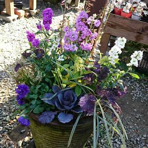 東と西の有名葉牡丹を使って寄せ植え! いよいよ今年も1週間をきりましたね。 葉牡丹が一番輝く時期になりました! 群馬県Kーplantsさんの久保田高生氏生産の葉脈の入ったオシャレ葉牡丹と兵庫県高見園芸さんの高見昌伸氏生産のマットカラーのオシャレ葉牡丹で寄せ植え。センターのフォーカルポイントには鹿児島県片山清美氏の落ち着いた色のビオラでまとめました。 使用した植物は、 アンティーク葉牡丹“ヴィンテージベイン”、葉牡丹“萌花ショコラ”、“萌花ブラック”、夢咲きヴィオラ“湖蒼umi”、八重咲き銀葉ストック“ベイビー”、リナリア“グッピー”、斑入りヤブコウジ、栄養系アリッサム“ストリーム”です。