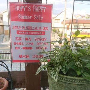 本日より後半戦スタート! 恒例の『ホピーのハッピーサマーセール』開催します! お持ち帰りのお客様に限り 花苗・鉢花 20%off 寄せ植え・バラ苗 20%off 庭木・観葉植物 10%off 植木鉢 10%off で販売致します! 是非この機会にお得にお買い物して下さいね! #夢と緑を運ぶ店ホピー#有限会社鈴蘭園#神戸市北区#園芸店#ガーデニング#花屋#花のある暮らし#植物のある暮らし#花好きと繋がりたい#神戸から発信#ホピーのハッピーサマーセール @ ホピー鈴蘭園