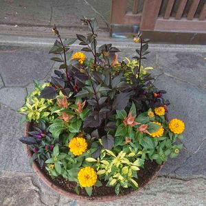 立派な玄関にハロウィンカラーで寄せ植えを作らせてもらいました! 10月に入り急に朝晩が冷えてきましたね。 酷暑の影響で傷んだ花壇や植木鉢の植え替えのご依頼が多くなってきました。 今日は毎年お伺いさせて頂いているお客様の大型コンテナの植え込み。 外壁の外はセロシアとジニア等、まだまだ秋の植物を使って植え替えさせて頂きました。 そして玄関前の大きなウェルカムコンテナには、ハロウィンカラーで寄せ植えを作らせて頂きました。 5種類の植物を3株ずつ、規則正しく植え込んで合計15株使用しました。 まだまだ冬の草花達の登場は先にして、皆様も今が旬の秋らしい植物達を育ててみませんか? 使用した植物は、 ブラックダリア“ブラックナイト”、セロシア“セルウェイ・テラコッタ”、八重咲きジニア“ザハラダブル・ブライトオレンジ”、大葉アルテルナンテラ“播州”、観賞用トウガラシ“コンガ”です。 #夢と緑を運ぶ店ホピー#有限会社鈴蘭園#神戸市北区#園芸店#花屋#ガーデニング#花のある暮らし#植物のある暮らし#花好きと繋がりたい#神戸から発信#寄せ植え#当店お勧め#ブラックダリア#ブラックナイト#セロシア#セルウェイ・テラコッタ#八重咲きジニア#サハラダブル・ブライトオレンジ#大葉アルテルナンテラ#播州#観賞用トウガラシ#コンガ#秋は秋の植物で