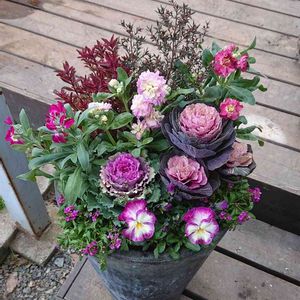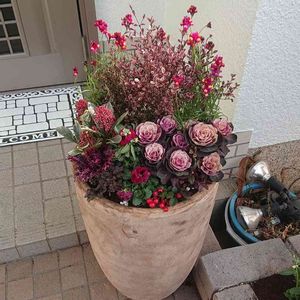 玄関前に設置させて頂いている大型コンテナにお正月用の寄せ植え 春に大型コンテナを沢山設置させて頂いたお客様。 夏の花が最近まで頑張ってましたが、先日冬バージョンに植え替えさせて頂きました。 玄関前の大きなウェルカムポットには、メインに地元兵庫県加西市の葉牡丹を使って豪華に寄せ植えさせて頂きました。 岡田園芸さんの“ヴェインモモタン”と花芳さんの“光子ポラリス”です。 基本は全体が赤色のイメージで作らせて頂きました。 喜んで頂けましたが、植木鉢だけで20㎏で、土と植物を入れて間違いなく40㎏位はあります。 寄せ植え全体の高さが鉢を含めて1m位になったので、持ち上げ難くくて、運ぶのに腰が抜けそうになりました(笑)。 使用した植物は、 ロフォミルタス“マジックドラゴン”、リナリア“エンチャントメント”、スキミア“ペローサ”、ギョリュウバイ、踊り葉牡丹“ヴェインモモタン”、葉牡丹“光子ポラリス”、うえたパンジー“天の羽衣”、オレガノ“ヘレンハウゼン”、ゴールテリア“チェッカーベリー”、八重咲きストック“ベイビー”です。