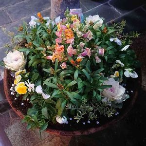 オレンジとイエローとホワイトカラーで! 昨日は今年最後の現場でした。 植え込みの最後に玄関前の大型コンテナに鉄板のビタミンカラーで寄せ植えさせて頂きました。 6種類の植物を各3ポットずつ規則正しく配置していって合計18ポット植え込みました。 鉢の真上から見るとバランスよく配置できたかな?と自画自賛(笑) センターに八重咲きのキンギョソウとチェイランサスを使い、ビオラと兵庫県加西市の中山園芸さんの個性的なオリジナル葉牡丹を使ってまとめてみました。 寒い冬でも温かい印象を持つ寄せ植えになったかなと思います。 使用した植物は、 八重咲きのキンギョソウ“トゥイニー・ブロンズシェード”、チェイランサス“シュガーラッシュ・オレンジ”、ビオラ“エッグタルト”、よく咲くスミレ“ミルクセーキ”、葉牡丹“ウォーターリリー”、ウエストリンギア・バリエガータです。 #夢と緑を運ぶ店ホピー#有限会社鈴蘭園#神戸市北区#園芸店#花屋#ガーデニング#花のある暮らし#植物のある暮らし#花好きと繋がりたい#神戸から発信#ビタミンカラーの寄せ植え#八重咲きキンギョソウ#トゥイニー・ブロンズシェード#チェイランサス#シュガーラッシュ・オレンジ#ビオラ#エッグタルト#よく咲くスミレ#ミルクセーキ#葉牡丹#ウォーターリリー#ウエストリンギア#バリエガータ#冬も温かい印象で