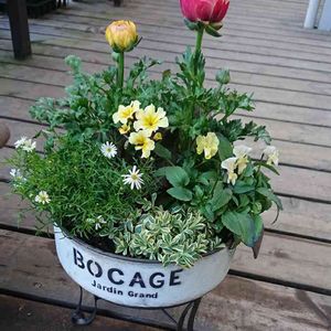 この時期に温かみを感じる花色で寄せ植え 待ち遠しい春に向けてビタミンカラーで作ってみました。 アンティークなラナンキュラスを背景に、フォーカルポイントは銅葉のプリムラで! しかし、肝心な葉が見えてない・・・(笑) ぞうさんビオラとシレネの葉色で明るさを入れつつ、ブラキカムの細葉でボリュームを出しました。 このスタンド付きのブリキ鉢も植えてみると、なかなか良いいですよ! 使用した植物は、 ラナンキュラス“セレンディ”、銅葉プリムラ“ジェシカ”、ぞうさんビオラ、ブラキカム“ホワイティ”、シレネ・ユニフローラ“シュネークライト”です。 #夢と緑を運ぶ店ホピー#有限会社鈴蘭園#神戸市北区#園芸店#花屋#ガーデニング#花のある暮らし#植物のある暮らし#花好きと繋がりたい#神戸から発信#寄せ植え#ブリキ鉢#ラナンキュラス#セレンディ#銅葉プリムラ#ジェシカ#ぞうさんビオラ#ブラキカム#ホワイティ#シレネ・ユニフローラ#シュネークライト