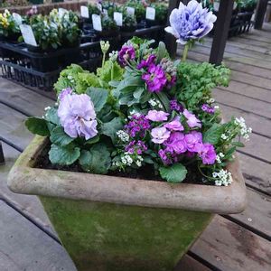 早くサクラソウに咲いて欲しい寄せ植え 全体のバランスがまとまるのに、左奥のサクラソウ“ダブルライラック”が早くモリモリ咲いて欲しいです! シックなショコラポットにブルー~パープル系の花色でまとめてみました。 多色植えのアリッサムは、信頼する生産農家さんがバラして植えてもOKと言っていたので、株分けして3ヶ所に植えました。 基本株分けできる様に作ってない株を無理に分けて植えると、主要な根を傷めてしまって弱ってしまうケースが多くあります。 特に寒いこの時期は、温室育ちの植物達はダメージを受けて枯れてしまうケースも多くありますので、安易な株分けはご注意下さいね! 農家さんの生産過程を知り、時期にあった作業が必須となります! 安易な株分けはご注意下さいね! 使用した植物は、 八重咲きアネモネ“凛々花”、八重咲きサクラソウ“ダブルライラック”、八重咲きストック“ベイビー”、八重咲きパンジー“ファビュラス”、変わり咲きプリムラジュリアン、アリッサム“クリアクリスタル・トリコロール”です。 #夢と緑を運ぶ店ホピー#有限会社鈴蘭園#神戸市北区#園芸店#花屋#ガーデニング#花のある暮らし#植物のある暮らし#花好きと繋がりたい#神戸から発信#当店お勧め#寄せ植え#八重咲きアネモネ#凛々花#八重咲きサクラソウ#ダブルライラック#八重咲きパンジー#ファビュラス#変わり咲きプリムラジュリアン#大輪アリッサム#クリアクリスタル・トリコロール @ ホピー鈴蘭園