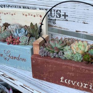 木箱に寄せ植え♡ さくらさんのご主人作の木箱に 色を塗りステンシルして 木工市でお迎えした苗をメインに 寄せ植えしました💕 可愛くできて大満足(*´艸`*)ウフ 小さめなサイズもいい感じ💕 お気に入りが増えて嬉しいです(*˘ᗜ˘*)♡ さくらさんパパ、さくらさん ありがとうございました❣️