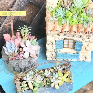 春に横浜のマルシェでお迎えした イクラちゃんのセメント鉢に やっとやっと寄植えした〜😊🎵 名古屋フラリエでお迎えした タニコロちゃんのピックも挿して🎵 玄関横のDIYした棚の特等席に 置いたよ〜〜«٩(*´ ꒳ `*)۶»