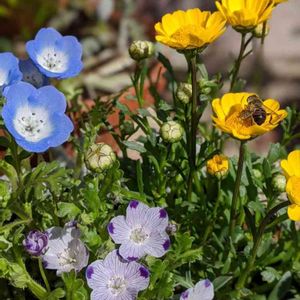 今日のお花💙ネモフィラ 先日。お天気良い日のpic🐝 今年もお迎え(*˘︶˘*).。*♡ 青のネモフィラのポットの中に一緒に白いコが 混ざったポットがひとつ😍ウレシイ✨