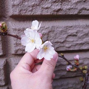 ご近所さんからソメイヨシノの枝をいただきました♪ 強風で倒れてしまった木から切り分けたものらしいのですが 倒れたのに枝には蕾が付き、あたたかくなるにつれて膨らみ始め そして我が家にやって来て、今日のお天気と気温で 蕾がポンポン開き出しました! すごい生命力です。 感動してしまいます。