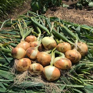 玉ねぎを収穫しました🧅 今年はちょっと小さめかな? ムギを刈って敷いて、自然農を演出…(*´꒳`*)