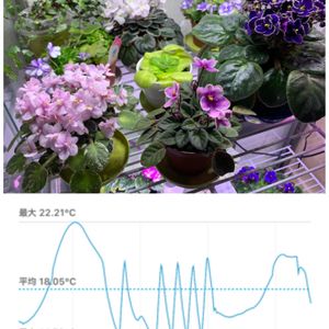ワーディアンケースのセントポーリア-4 棚上段の全体picと24時間温度変化です😊 最低15度から20度位まで変動してます。 15度より下がるとサーモスタットが作動し、パネルヒーターがオンになります。 グラフの上下はそれを表してます🤗 ミニセントポーリアにはこの温度設定が丁度良いみたいですね😄