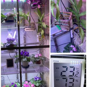 ガラス温室のセット😊 今朝室内で15度を少し切りました😄 ガラス温室に暖房をセットしました😊 LEDライト本体に熱があり、日中は暖房不用みたいです🤗 サーモスタットは16度に設定。16度を切るとパネルヒーターがつきます。その上の棚に水を入れた鉢皿を置いて湿度UP。 攪拌扇は2個で、23度を越すと回ります。 LEDライトはタイマーで7時半点灯、18時半消灯に設定。 バンダ2株入れて見ました。 セントポーリアと同居です🤗