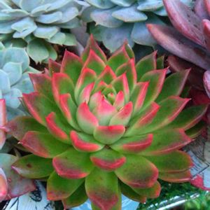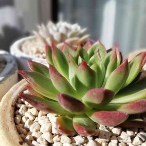 うちに来てすでに5年は経ったエケベリア。 この間久しぶりに植え替えしたら、葉がぐわっと広がりました😊 紅葉するタイプなのかしら? 先っちょがかすかに赤い…🤔