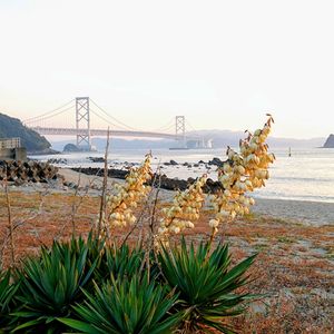 鳴門市千鳥ヶ浜のキミガヨランと鳴門大橋です🌉 キミガヨランをこんなに近くで見たのは初めて。香水のような香り(*^^*) ランでは無くユッカ属なんですね。