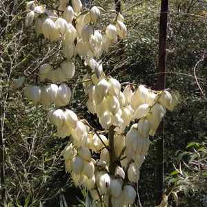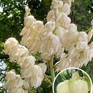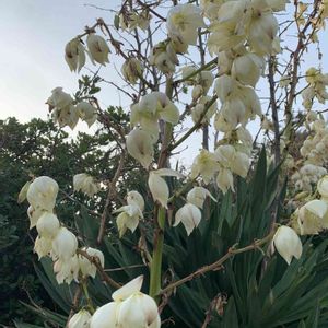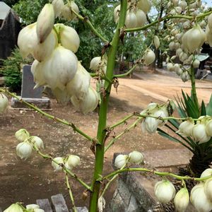 ~キミガヨラン(君が代蘭)~です💠 バラ園の高台から見えます。 リュウゼツラン科ユッカ属の 耐寒性常緑低木です。 大きな白~薄黄色で鐘形をした花を 多数下向きに咲かせます🔔 開花期:一度で6月~11月