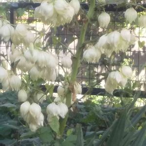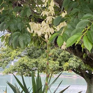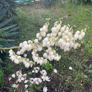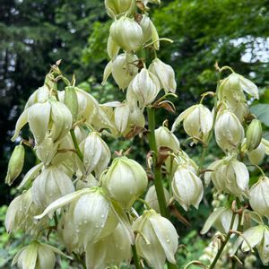 小石川植物園 1 キミガヨランが咲いていました。 午前中の雨粒が残っています🤗 リュウゼツラン科 Yucca recurvifolia