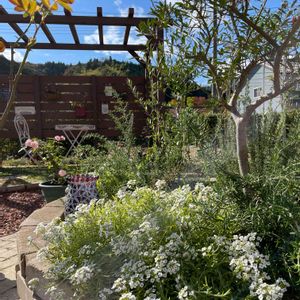 今朝はいい天気〜✨🧚♂️ スーパーアリッサム 一株でこんなに大きくなって ✂️✂️しても元気〜👍 昨日は紫色のスーパーアリッサム をgetしたので今朝植えたところ きっと大きくなってくれるはず💕💖 庭の中央が華やかに〜🧚♂️🌹