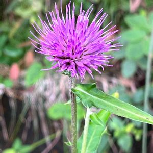 🏷️今更ですが④ 9/23日撮影 ※キク科アザミ属 本州中部以北の山地や草原、林縁でみられる 茎の高さ60cm〜1m 葉は羽状に中裂し縁にはトゲがある 花期 8〜10月 茎の上部で枝分かれし上向きに花をつける 花(筒状花序)は筒状花のみで構成されており色は紫色 総苞にクモ毛があり粘らない そり返らない規則正しい短い総苞片が目立つ 花期にも深く裂けた根生葉が残っているのが特徴 すみません🙏また真上から撮ってしまいました