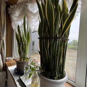のっぽ過ぎる我家のサンスベリア🪴 奥の鉢は小さな鉢にギューギューになりすぎ植え替えました✨ あ〜 スッキリした〜って言ってます😅 手前のは、また次の機会に・・・ でも、天井にぶつかっちまうよ〜 との叫びも聞こえるんですけどね(≧︎▽︎≦︎)/
