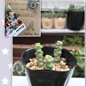 GSを始めて3日目に 3周年のプレゼント企画があって ど厚かましく応募した私🤗 なんと当選してしまいました🎉 嬉しい😃💕 植物の名前をほとんど知らない私。 草花はほぼ100%枯らしてしまう私。 でも好きなんです😊 多肉植物にどっぷりハマって日々勉強しながら楽しんでます。 これからもよろしくお願いします☺️ で、先日道の駅で狩ってきた 名もなき小さな小さなイモムシみたいな多肉ちゃん。 これは何ていう多肉ちゃんですか?