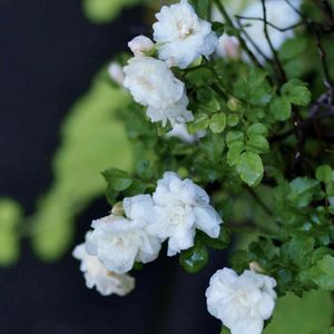 去年お迎えしたミニバラ のプチシャンテスノーシャワー が咲き始めました💕 去年と同じくアイビーを埋め込んだバスケットに鉢植えのミニバラを乗せています😊グリーンアイスが終わりかけると咲き始めます❣️ *ネットから。 「プチシャンテはクリーピングタイプ(ほふく性)のミニバラです。ほかのバラには見られないしなやかで細い枝を伸ばし、カーペット状の植え込みや、ハンギングバスケットにも使えるバラ。ぽんぽん咲きの花はたいへん繊細で可憐です。病気に強く、バラが初めての方にでも簡単に育てられます。切り戻しをしなくても枝数が増え、次々と花を咲かせ長い期間楽しめます。 開花時期:6月~12月 花色:白の八重咲き 花形:ポンポン咲き 花弁数:70枚 花径:4cm 伸長:0.2m 樹形:横張り性 芳香:中香 用途:ハンギングバスケット、鉢植え 栽培方法:6号~8号鉢に1ポットが適当です。鉢は冬越し後に植え替えます。日当たりの良い場所で、水持ちの良い園芸用土を使って栽培し、植え込み時と毎月1回化成肥料を、2週に1回液体肥料を与えます。水をきらさないよう、たっぷり水やりして下さい。 屋外でも冬越しし、11月に花が終わります。その後鉢のふちに沿って枝を切ります。」