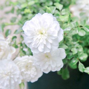 ミニバラ スノーシャワー 可愛く咲いてきました♡︎ᵎᵎᵎ♡̷︎♡⃜︎♡⃡︎ 純白で花びらがいっぱい、小さいながら目を惹くミニバラです💓 玄関先のレイズドベッドに入ってます(*´∀`)♪