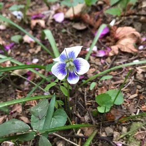 今日の花 ❇︎ スミレ ❇︎ 庭のシュロチクの鉢の足元 飛んで来た種からのスミレ🌱💜 今年の4月中旬 小さな庭から♡