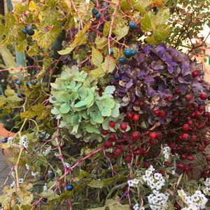 お疲れ様〜私♡ お出かけが キャンセルになったので お庭の片付けに着手❣️ 紫陽花がいい感じに ドライ気味に。 ノブドウの青い実も✂️😍 野ばらのヒップも✂️🌹 リースにしてみます。 上手くいくかしら?