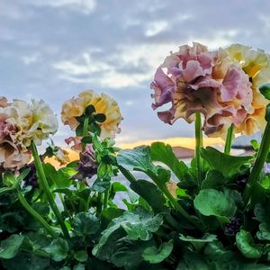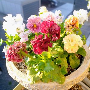 【ローブ・ドゥ・アントワネット & ロココ】 朝の花活終了😅💦💦 ローブ・ドゥ・アントワネットとロココのMIX 正確にはアントワネットが5 ロココ1 偶然見つけた2苗入りが2 1苗が2 なので 4苗の寄せ植えなんだけどね 6色展開です。 アントワネットの色の展開は 好きだな… 色々なお色をMIXしてもジュエリーBOX見たいで楽しい🤗 使ってる培養土は かなり空気の層をメインにしました。 ハイドロボールを鉢底に使い パーライト ゴールデン培養土 とにかく 寄せ植えのデメリットを考慮した配合? 混ぜてませんがw 土壌に空気の層が有ればギュウギュウに寄せても問題は無い 寄せ植えやギャザリングほど 拘り 配慮しなきゃと思いますよ… ただ詰め込めば良いと言う考え方は 植物達を苦しめてるだけ まっ 弱い苗から駄目になるだろうな… ギャザリングばかりしてると 脱落苗があるとギャザリング自体 失敗となるんだよね そこだけ穴があるギャザリングになるので 致命傷となるんだよね😓 特にハンギングになるとよけい目立つ やり直しが効かないので 土壌に拘らないとなんだよね 今回の場合ゴブレット鉢なら なんとでもなるけどねw🤗