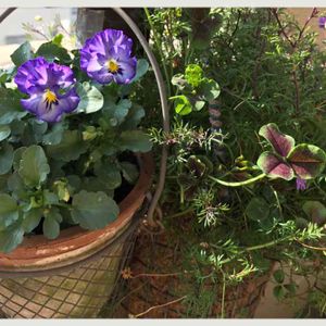 寄せ植え〜🌿 ビオラのみだった鉢にグリーンを追加✨✨😊 葉っぱも大事な脇役です🌿🌿