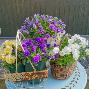 ミルフルちゃん達見頃です 今年の爆咲で整ってるで賞は薄紫色のミルフルちゃんが受賞ですね(4·5枚目) バスケットには、白いビオラの親株と挿し芽を植えています 八重咲きパンジーファビラスちゃんも、なかなか良いですね 優秀賞