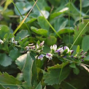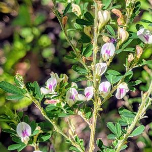 ハイメドハギ(這蓍萩) マメ科 ハギ属 8~10月 10~50cm 在来種 多年草 メドハギの変種 茎は地を這って広がり、障害物がなければきれいに放射状に広がる 茎は普通、開出毛がある(無いものもある) 葉は3小葉で密につく 托葉は線形、葉裏に伏毛 蕾は紫色 花は旗弁の裏が紫色で、表の中央部が基部から端まで帯状に紫色を帯びる 舟弁の先も紫色になる 旗弁∶立ち上がっている大きな花弁 舟弁∶雄しべ • 雌しべを包む下方の2枚の花弁 (竜骨弁) 萼は5深裂 果実(豆果)は扁平な円形~楕円形で中に1個の種子を含む 過去に見たものは、本当に地を這っていてとても小さかったのですが、周りに他の植物があるとむしろ元気すぎるほど茎を上方に伸ばし、ヤンチャな匂いがしたw😀