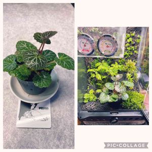 ユキノシタさん。葉脈と繊細な毛がイイ感じです。テラリウムの端っこにひっそり置くつもりだったんすがストックケージ内で荒ぶる成長を見せて、こりゃ無理レベルにオーバーサイズ。30×45買ったら使います。@温湿度計は仮に入れてるだけ。←70〜80%キープ出来てます。