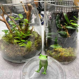 エキゾテラ ナノでテラリウムを作ってますー。ミスト発生装置は外掛けのサテライト水槽に仕込んでスマートタップで1時間に5分流し込む設定。稼働中はミストが前面のスリットから漏れてくるので(稼働中は)空気の循環はイイ感じに出来てる模様。ジャカランダはどうなるか解りませんw。流木で嵩上げしてトキワシノブでもイイかも。 このネタ続きます。