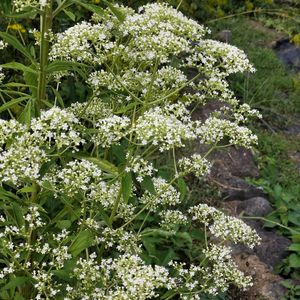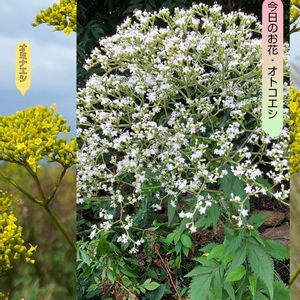 9月11日 今日のお花 🌿🤍💛オトコエシ(男郎花)💛🤍🌿 花期 8〜10月 花は白い。オミナエシに比べ、がっしりした感じがするので、名がついた。 清楚な花だからと花瓶に活けたが最後水替えの度に腐った醤油の臭いがする。毒性はなく、根は敗醤根という漢方薬に、葉は飢饉のときの食用にと利用されました。同じ仲間ののオミナエシ(女郎花)は秋の七草の一つで、黄色い花を咲かせます。 オトコエシの別名には、**「男郎花(おとこおばな)」「チメクサ」「トチナ」「オトコメシ」「シロアワバナ」「敗醤(はいしょう)」**などがあります。