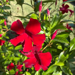 公園の入り口からマンデビラの釣花や、アーチ仕立てで迎えてくれました。 赤、ピンク、白、クリーム色 色とりどりの花が満開。良く手入れされた公園です。 4️⃣はお気に入りの色 ’クライミング サンパラソル ピーチオレンジ'