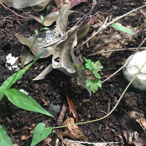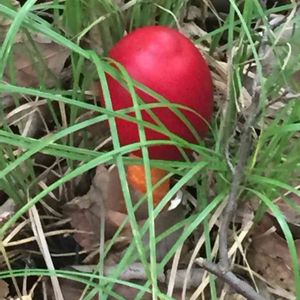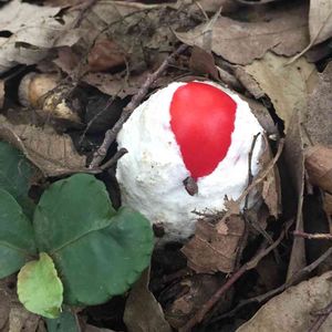 今年はもう終わりと思っていたタマゴダケ。何段階かの姿が一緒に見られたので成長の様子を5連続で投稿します。5枚のうちの①土から誕生