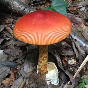 最後は更に成長し色は赤からオレンジ色に最初は卵型 やがて饅頭型 最後に平らな形になり黄色味を帯びてきます。縁はひだになりツカは黄色に なります。食べられると言われていますがあくまで鑑賞です。5枚のうちの⑤です。一同に見ることが出来てラッキーでした。( ◠‿◠ )