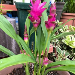 散歩道で見かけた、クルクマ アイルージュ。(と言うらしい) 植木鉢で元気に.綺麗な花を咲かせていました。