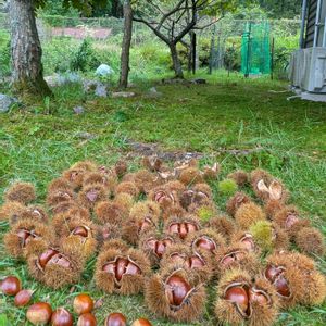 栗拾いが忙しくなってきました。 三種類が同じ畑に植えられており、枝が重なるところは区別しながら拾っています。ぽろたん以外は出荷するので。 いまだに違いを見極めるのは少し難しいです💦 *ぽろたん→おにぎり型 *筑波→スタンダード型 *銀寄→にまーっ😁と笑ってるみたいに見える 銀寄は晩生種なので、今の時期に落ちるのはほぼ虫喰い😣