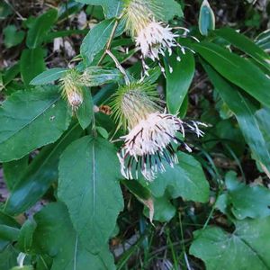 キクバヤマボクチ 当地ではもっとも普通に出会うことが出きるヤマボクチの仲間(^∇^) 濃褐色の集約雄しべに隠れていた雌しべは徐々にせり上がり,中の花粉を外に押し出す仕組みだ(^^) これが咲き進むと冠毛がでてきて、どんどんモフモフになっていく(ノ)•ω•(ヾ)