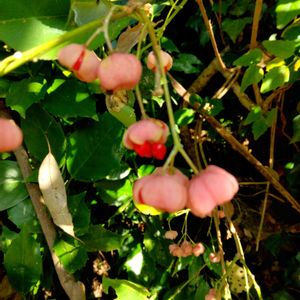 今日のお花💠マユミ ニシキギ科、5~6月に小ぶりの花が咲く アク抜きした新芽は食べられるが、種子は毒性がある 木は柔軟性があり、良くしなり、弓の材料になった事が、縄文時代の遺跡から証明されている(名前の由来) 紅葉と共に実がピンクに色付き、熟すと果皮が自然に裂けて中から紅オレンジ色の仮種皮(かしゅひ)が顔を出す 🌿初めてマユミに出会い、ピンク色に鈴なりになっている果皮と赤い仮種皮を見て、びっくり❣️感激です💓 古代から人も鳥もこの自然の恵みに癒されてたのかなぁ( * ॑꒳ ॑* )♬.*゚