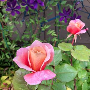 今日も爽やかないいお天気☀️ 咲きかけのディスタントドラムス🌹が美しい瞬間✨ 後ろはクレマチス・アフロディーテ・エレガフミナ💜3年目になり、沢山咲いています❣️