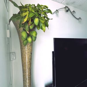 重過ぎて飾る器が無く 居間端オブジェ器へとりあえず移動 マンゴー収穫 オブジェ下↓は 洗濯用🧺カゴを、実は置いて 落ちるの待っています🥭🌺 アローハッ🤗
