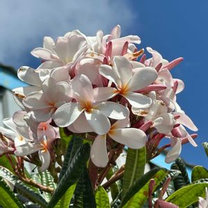 プルメリア 花弁が通常のより 細くて長く、ちょっとカーブを 描いていてスレンダーなタイプ 香りも薄っすらな感じで清楚な感じ フルブルームです♪アローハッ🌴