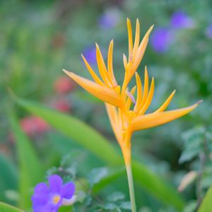こちらはいつもの散歩道のヘリコニア。ゴールデントーチの方。紫のツンベルギアとお似合いです。