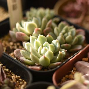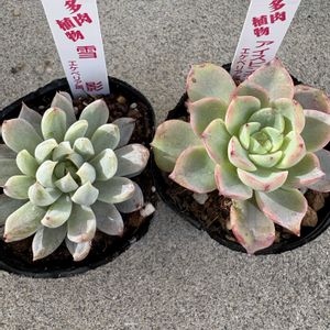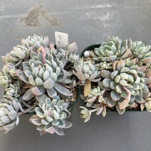 雪影 雪雛とそっくりさん! 向かって左、親株です。 中央の大きい子の周囲は子株の群生です☺️ 右、手前の大きな1つが水差しぶつけて折れた親株の子株の一枝からの群生です♪ 2〜3年で群生株に育ちます! 暑さ寒さにとても強く元気です😊 普及種頑張れ!