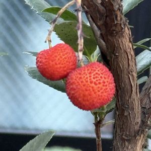 これなーんだ❓ 真っ赤に熟して ヤマボウシみたい 今のお散歩で出会いました❤️❤️💛 💛❤️イチゴノキ❤️💛 お初です アメリカ山公園にもありますが、お花や実 見たことありませんでした 🍒 🍒 🍒 🍒 🍒 🍒
