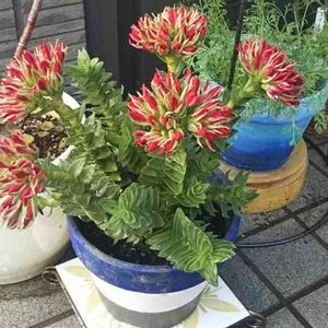 昨日の名前がわからないこの花、引き続き正式な名前をご存知の方のお知恵を拝借頂きたいです。何卒よろしくお願いします。 今日は植え替えをしました。 ちょっとやり過ぎたかなぁと思っていた自己主張の強い三色ペイントの鉢に負けない華やかな花です。 何処に置くのがベストなのかまだわかりませんが。 正式な名前がわかるまではこの花の名前は「ロブスター(仮)」です。 【 追記】 この花の名前は「ロケア」であると教えて頂きました。ありがとうございました❀.(*´ω`*)❀.