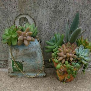 《娘ちゃんの作品》 azi-azi ティンルーフプランターS 650円 丸和貿易 ウェディング ミケS 300円 ファミリーピック 50円 多肉植物1号 130円 *ベビーサンローズ *ワテルメイエリー *サブセシリス *花うらら 多肉植物の培養土 580円