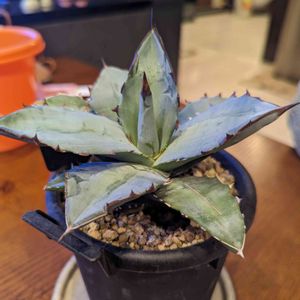 12月中旬にお迎えしたコ アガベ チタノタブルー どうしてもアガベが気になるようになった頃、始めて行ったお店で出会いました この辺りのお店ではアガベの数は豊富な方でしたが値段が高くて… カッコいいでしょ!大きくなると更にめっちゃカッコいいんだよ!と 旦那さんをそそのかし、まんまとそそのかされ、小さいサイズなら、とお迎え🌱 2号鉢サイズで、今思えば少し高め設定だったかも 一応旦那さんからのお預かりのコという名目となっています🤭